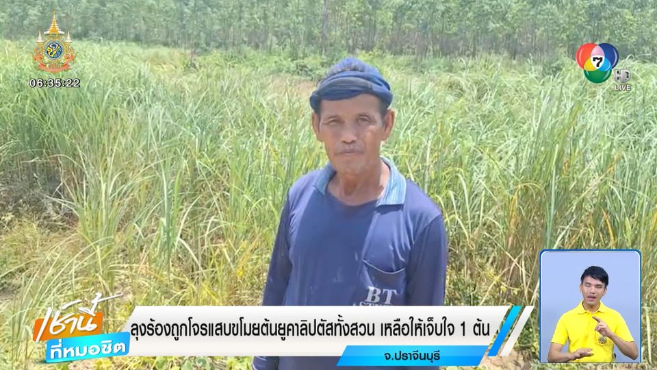 เช้านี้ที่หมอชิต - ที่ปราจีนบุรี คุณลุงสุดช้ำ ปลูกต้นยูคาลิปตัส 4 ไร่ กว่า 700 ต้น ถูกโจรแสบบุกขโมยทั้งสวน เหลือทิ้งไว้ดูต่างหน้าต้นเดียว