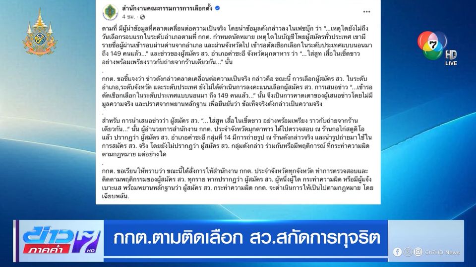 สำนักงานคณะกรรมการการเลือกตั้ง หรือ กกต. ชี้แจงผ่านหน้าเพจเฟซบุ๊กของ กกต. หลังมีการโพสต์ว่ามีผู้ผ่านการคัดเลือกสว.ในระดับอำเภอ ระดับจังหวัดแล้ว 149 คน และรอไปคัดเลือกระดับประเทศ ที่อาจเกิดการเข้าใจที่คาดเคลื่อน จึงเป็นการคาดเดาโดยไม่มีมูลความจริง และปราศจากพยานหลักฐาน เพราะขณะนี้ยังไม่มีการเลือกสว.ในระดับอำเภอ ระดับจังหวัด และระดับประเทศ ส่วนที่พบว่า ผู้สมัคร สว. ถ่ายรูป และใส่เสื้อสูทเชิ้ตขาวอย่างพร้อมเพรียงในร้านถ่ายรูปเดียวกัน แต่ได้ให้ผู้อำนวยการสำนักงาน กกต. ประจำจังหวัดดังกล่าว ได้ไปตรวจสอบ พบว่าเป็นการถ่ายรูปมาสมัคร สว.โดยยังไม่ปรากฏว่าผู้สมัคร สว. กลุ่มดังกล่าวร่วมกันหรือมีพฤติการณ์ที่กระทำความผิดตามกฎหมายแต่อย่างใด อย่างไรก็ตามได้สั่งการให้สำนักงาน กกต. ทุกจังหวัด ตรวจสอบ และติดตามพฤติกรรมของผู้สมัคร สว. ทุกราย หากปรากฏว่ากระทำความผิด หรือมีผู้แจ้งเบาะแส พร้อมพยานหลักฐานว่า ผู้สมัคร สว. กระทำความผิด กกต. จะดำเนินการให้เป็นไปตามกฎหมาย โดยเฉียบพลัน