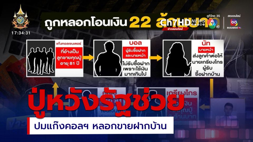จากกรณี คุณไพรสัณต์ คุณปู่ อายุ 81 ปี ที่โดนแก๊งคอลเซนเตอร์อ้างเป็นตำรวจ หลอกว่าถูกนำชื่อไปเปิดบัญชีรับโอนเงินจากการทุจริต แล้วหลอกให้โอนเงิน 19 ล้านบาท ให้แก๊งคอลเซนเตอร์ อ้างว่าเพื่อตรวจสอบ จากนั้นหลอกให้นำบ้านไปขายฝากอีก 3 ล้านบาท แล้วนำเงินที่ได้จากการขายฝาก ไปโอนให้แก๊งคอลเซนเตอร์ทั้งหมด รวมแล้วโอนเงินไปทั้งสิ้น 22 ล้านบาท