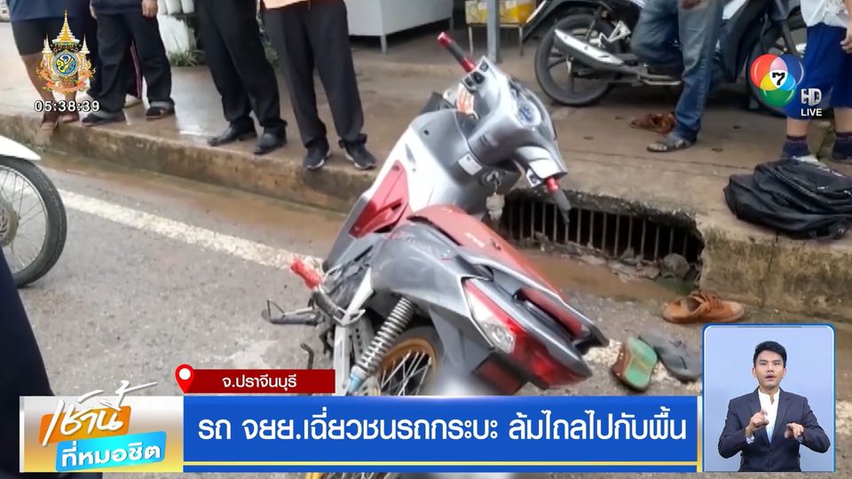เป็นภาพจากกล้องวงจรปิดที่ติดตั้งไว้บริเวณด้านหน้าร้านค้า ในเขตเทศบาลตำบลศรีมหาโพธิ ที่บันทึกภาพรถจักรยานยนต์ที่ซ้อน 3 กันมา ไถลไปกับพื้นถนน หลังจากเฉี่ยวชนกับรถกระบะสีขาว และมุดเข้าไปใต้ท้องรถกระบะที่จอดอยู่ริมถนน เคราะห์ดีที่ทั้ง 3 คน ยังสามารถลุกขึ้นมาได้ เพราะได้รับบาดเจ็บเล็กน้อย มีบาดแผลถลอกตามร่างกายหลายแห่ง