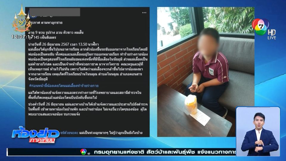 ห้องข่าวภาคเที่ยง - หัวใจคนเป็นแม่แทบแหลกสลาย หลังส่งลูกชาย 9 ขวบ เข้าโรงเรียนไปแล้ว แต่มารู้ทีหลังว่าสามีที่เลิกราไป พาภรรยาใหม่บุกไปลักพาตัวลูก