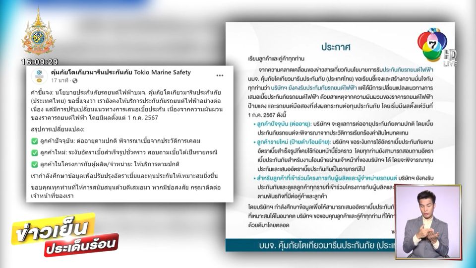 ข่าวเย็นประเด็นร้อน - บริษัท โตเกียวมารีน ชี้แจงดรามา หลังมีข่าวไม่รับประกันภัยรถยนต์ไฟฟ้า เริ่มวันแรก ตั้งแต่เมื่อวาน ยืนยันยังรับประกันภัยตามปกติ แต่แค่เปลี่ยนแปลงแนวทางเท่านั้น