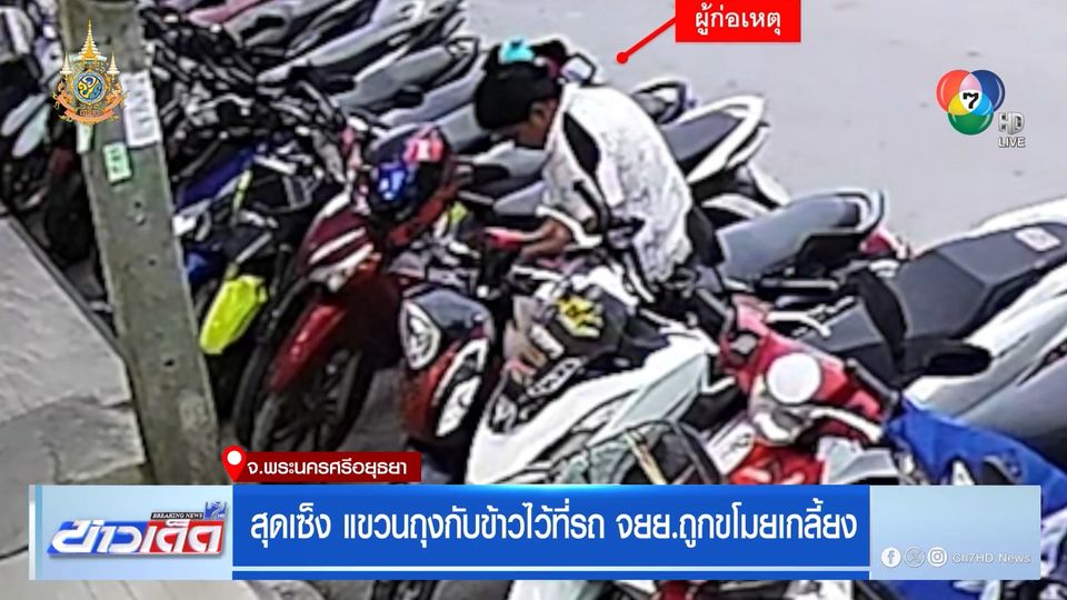 ข่าวเด็ด 7 สี - กล้องวงจรปิดหน้าร้านหมูกะทะแห่งหนึ่ง ในตำบลคานหาม อำเภออุทัย จังหวัดพระนครศรีอยุธยา บันทึกภาพหญิง อายุประมาณ 35-40 ปี นั่งอยู่บนรถจักรยานยนต์ ทำทีเหมือนเป็นเจ้าของรถ ก่อนมองซ้ายมองขวา แล้วหยิบถุงกับข้าวที่แขวนไว้กับรถมาเลือกดู จากนั้น หิ้วถุงกับข้าวทั้งหมดเดินหายไปในตลาดนัด