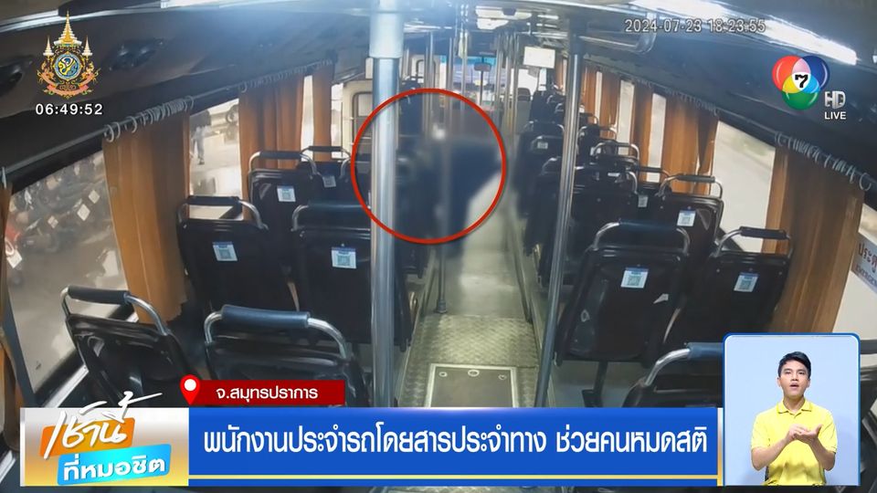 เป็นภาพขณะผู้โดยสารหญิงที่โดยสารรถโดยสารประจำทางปรับอากาศ สาย 138 กำลังจะลงจากรถที่บริเวณท่าจอดรถ ประจำทาง ขสมก. ริมถนนเขื่อนขันธ์ ตรงข้ามที่ทำการไปรษณีย์ปากลัด ท่าน้ำพระประแดง จังหวัดสมุทรปราการ ที่ทรุดตัวลงนั่งบริเวณบันไดของรถ โดยพนักงานเก็บค่าโดยสาร และพนักงานขับรถ ต่างรีบเข้าไปให้การช่วยเหลือปฐมพยาบาล ก่อนรีบโทรศัพท์แจ้ง 1669 เพื่อขอความช่วยเหลือ