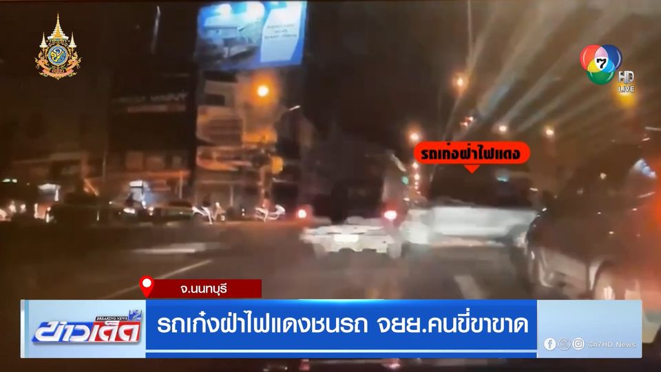 ข่าวเด็ด 7 สี - กล้องหน้ารถบันทึกภาพขณะสัญญาณไฟจราจรเปลี่ยนเป็นสีเขียว รถจักรยานยนต์ขี่ข้ามแยกไปพร้อมกับรถกระบะ จังหวะนั้นมีรถเก๋งซิ่งฝ่าไฟแดงชนเข้ากับรถจักรยานยนต์ จนกระเด็นอัดกับรถกระบะอีกคัน เหตุเกิดกลางสี่แยกสวนสมเด็จพระศรีนครินทร์ ตำบลบ้านใหม่ อำเภอปากเกร็ด จังหวัดนนทบุรี