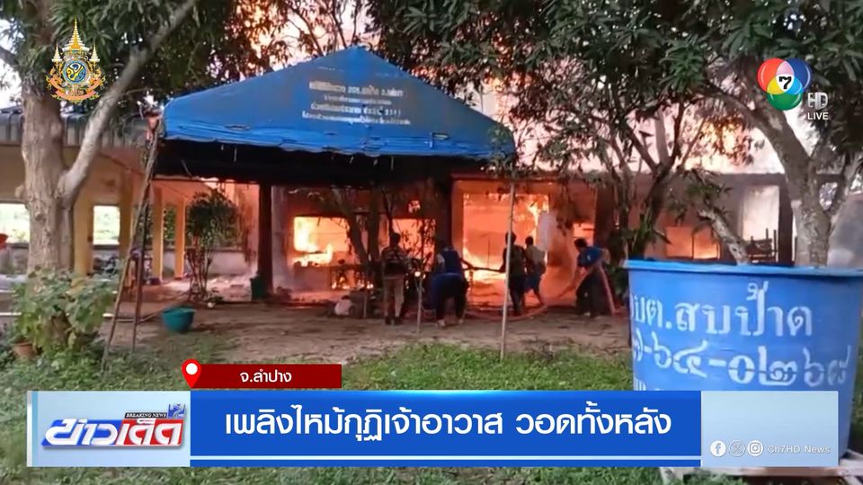 ข่าวเด็ด 7 สี - เจ้าหน้าที่ดับเพลิง เร่งฉีดน้ำสกัด เพลิงลุกไหม้ กุฎิเจ้าอาวาส วัดบ้านสบเติ๋น หมู่ที่ 2 ตำบลสบป้าด อำเภอแม่เมาะ จังหวัดลำปาง ซึ่งเป็นอาคารสองชั้นครึ่งปูนครึ่งไม้