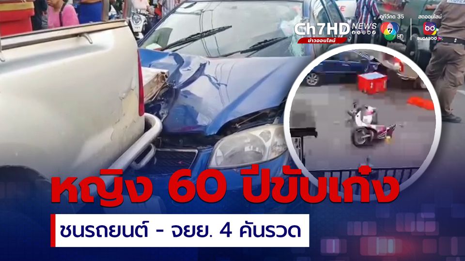 หญิง อายุประมาณ 60 ปี ขับเก๋งพุ่งชนท้ายรถน้ำแข็งเสียหลักชนรถกระบะ รถจักรยานยนต์รวม 4 คันมีผู้ได้รับบาดเจ็บสาหัส