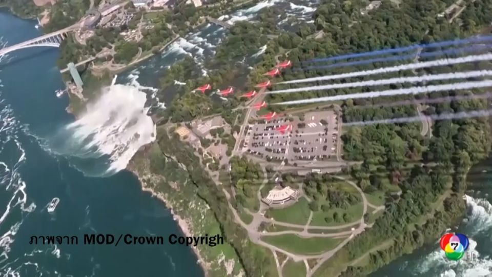 "เดอะ เรด แอร์โรว์ส" ทีมนักบินผาดแผลงของกองทัพอากาศสหราชอาณาจักร บินโชว์เหนือน้ำตกไนแอการา ขณะเดินทางทัวร์แคนาดา