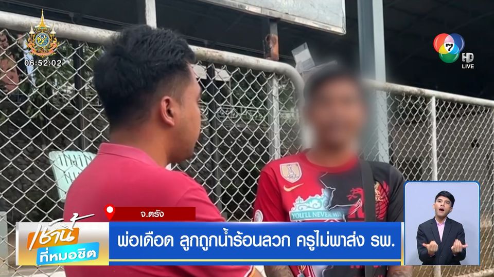 ทีมข่าวจึงลงพื้นที่ พบพ่อของเด็กนักเรียนขณะเฝ้าอยู่หน้าห้องฉุกเฉิน โรงพยาบาลศูนย์ตรัง เพื่อทำการรักษา โดย พ่อของเด็กหญิง เล่าว่า เมื่อวานเป็นวันสอบวันสุดท้าย ซึ่งหลังทราบว่าลูกสาวถูกน้ำร้อนลวกช่วงเที่ยงก็รีบไปรับลูกสาว โดยครูประจำชั้น บอกว่า ลูกสาวถูกเพื่อนที่ซื้อบะหมี่กึ่งสำเร็จรูปมาจากพ่อค้าแม่ค้านอกโรงเรียนทำหกใส่ เมื่อสอบถามว่า ทำไมครูถึงไม่ส่งลูกไปโรงพยาบาล หรือเรียกรถพยาบาล 1669 มารับไปส่งก่อน ซึ่งครูก็บอกว่า ตอนนั้นคิดว่าลูกคงจะเจ็บไม่เยอะ เพราะช่วงแรกแผลยังไม่พุพอง จึงได้ประสานผู้ปกครองมารับไปส่งโรงพยาบาลเอง