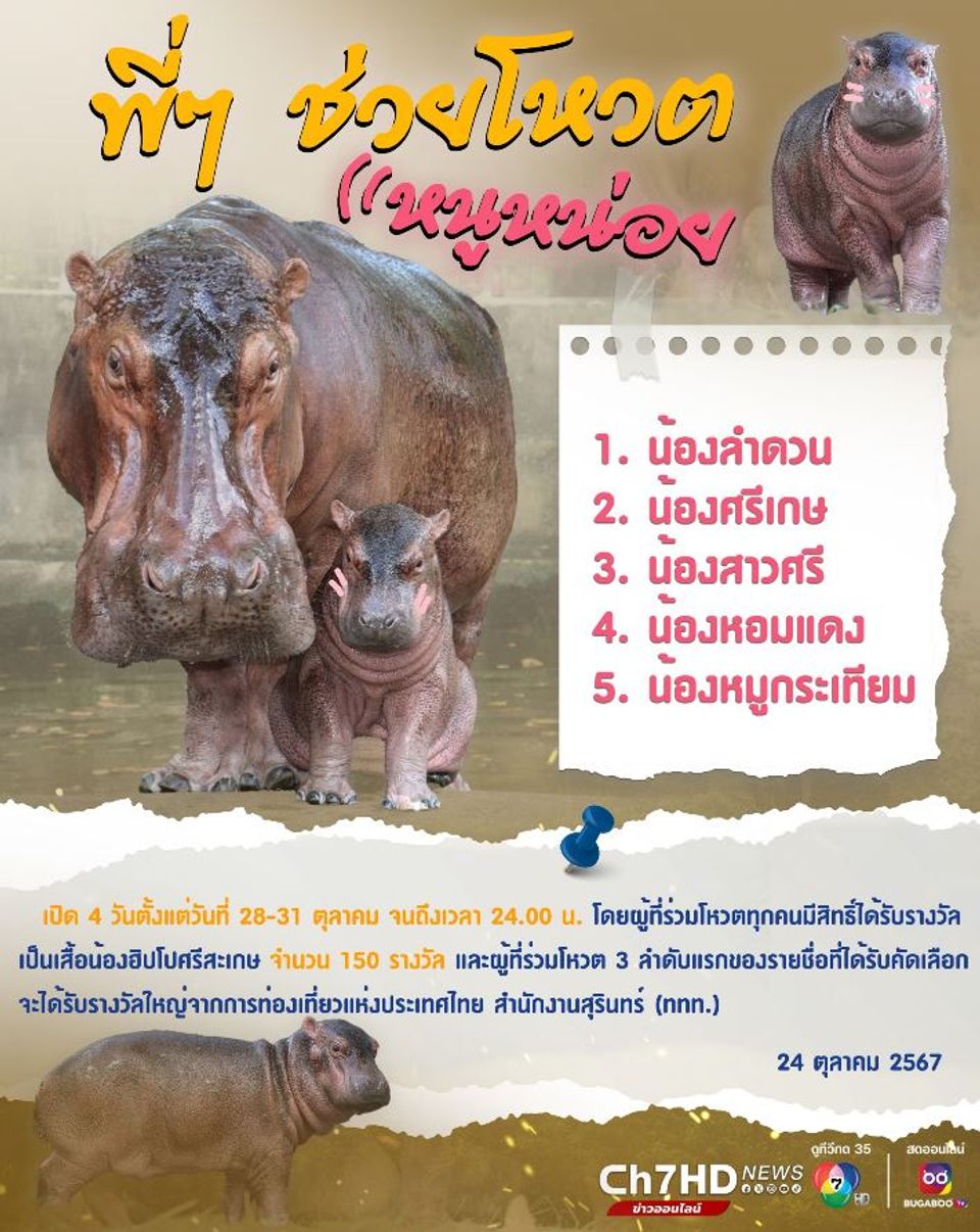 สวนสมเด็จพระศรีนครินทร์ ศรีสะเกษ ชวนเลือกชื่อ ลูกฮิปโปฯตัวใหม่ เตรียมเปิดโหวต 28-31 ตุลาคม นี้ มี 5 ชื่อให้เลือก คือ 1. น้องลำดวน 2. น้องศรีเกษ 3. น้องสาวศรี 4. น้องหอมแดง 5. น้องหมูกระเทียม