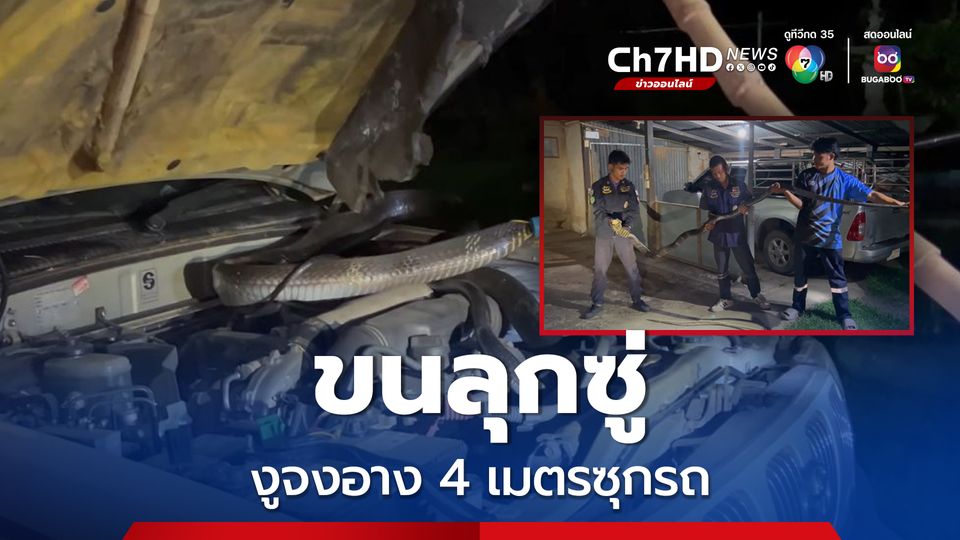 กู้ภัยสมาคมสว่างบุญช่วยเหลือธรรมสถานตราด ช่วยกันจับงูจงอาง ความยาว 4 เมตร หลังเลื้อยเข้าไปซุกในห้องเครื่องรถยนต์ของชาวบ้าน