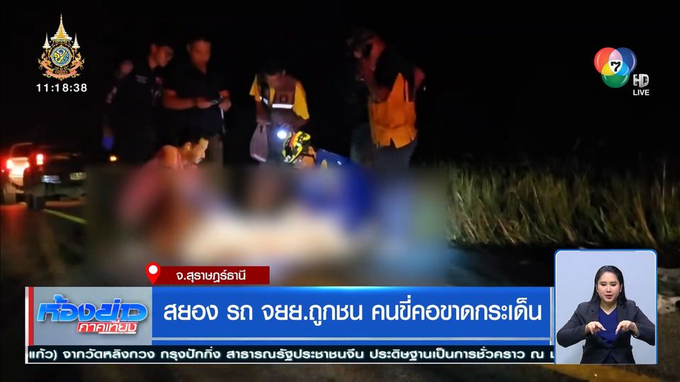 ห้องข่าวภาคเที่ยง - เกิดเหตุสยองริมถนนที่จังหวัดสุราษฎร์ธานี ชายอายุ 51 ปี ลูกจ้างตัดปาล์มน้ำมัน ขี่รถจักรยานยนต์อยู่ริมถนนสายเอเชีย ถูกรถยนต์เฉี่ยวชนจนคอขาด ศีรษะกระเด็นไปตกอยู่ในพงหญ้าข้างทาง จุดเกิดเหตุห่างจากบ้านตัวเองแค่ 2 กิโลเมตร