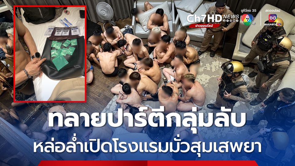 จากนั้นจึงได้แสดงตนเป็นเจ้าหน้าที่ตำรวจ เพื่อขอทำการตรวจค้น โดยแบ่งกำลังเข้าตรวจค้นตามบริเวณทั่วไปภายในห้อง พบนักท่องเที่ยวในห้องดังกล่าวมากกว่า 100 คน เป็นชายหุ่นล่ำ ใส่เพียงกางเกงในตัวเดียว ผลการตรวจค้นเบื้องต้นตรวจพบยาเสพติดให้โทษประเภท 1 (ยาอี) จำนวนหนึ่ง และวัตถุออกฤทธิ์ต่อจิตและประสาทประเภท 2 (ยาเค หรือ คีตามีน) อีกจำนวนหนึ่ง จึงควบคุมตัวนักท่องเที่ยวทั้งหมดพร้อมของกลางมาสอบสวนที่ สน.ทองหล่อ