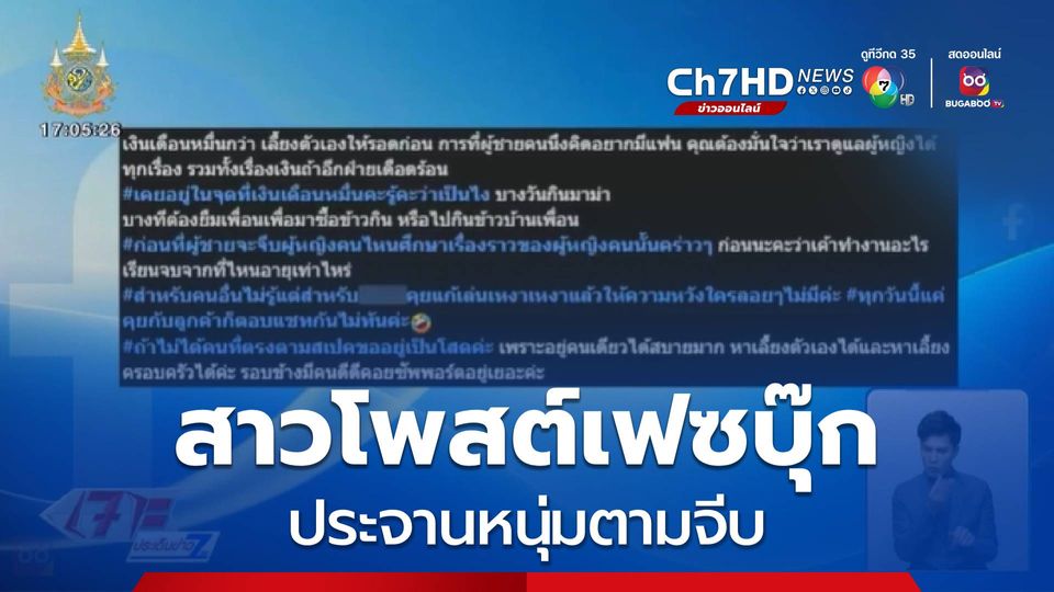 เจาะประเด็นข่าว 7HD - เดี๋ยวนี้จะจีบผู้หญิง เป็นคนดีอย่างเดียวไม่พอ แต่ต้องมีเงินเลี้ยงตัวเองและครอบครัวได้ด้วย มิเช่นนั้น ขืนทักไปจีบสุ่มสี่สุ่มห้า อาจเหมือนกรณีนี้ สาวโพสต์เฟซบุ๊กประจานหนุ่ม เงินเดือนแค่ 10,000 บาท กล้ามาจีบ ไม่เช็กโพรไฟล์ งานนี้ทัวร์ลงเจ้าของโพสต์ยับ จนแทบเพิ่มลานจอดไม่ทัน