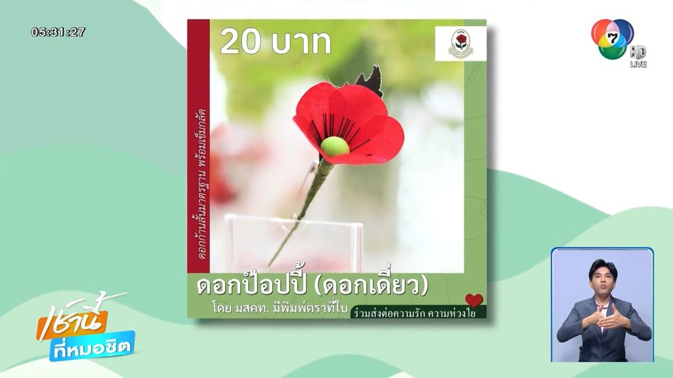 เช้านี้ที่หมอชิต - "สัปดาห์ดอกป๊อปปี้บาน วันทหารผ่านศึก" 27 มกราคม ถึง 3 กุมภาพันธ์นี้ ขอเชิญชวนทุกท่านซื้อดอกป๊อปปี้ ร่วมช่วยเหลือครอบครัวทหารผ่านศึก ได้ที่ มูลนิธิสงเคราะห์ครอบครัวทหารผ่านศึก ในพระราชูปถัมภ์สมเด็จพระศรีนครรินทราบรมราชชนนี Line : @popythailand โทร. 0-2245-3303, 09 2750 2642