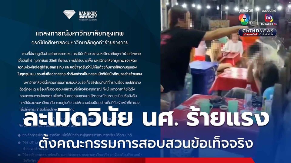 กรณีนักศึกษาของมหาวิทยาลัยถูกทำร้ายร่างกาย เมื่อวันที่ 6 กุมภาพันธ์ 2568 ที่ผ่านมา จนได้รับบาดเจ็บ มหาวิทยาลัยกรุงเทพขอแสดงความห่วงใยต่อผู้ได้รับผลกระทบ และขอย้ำจุดยืนว่าไม่เห็นด้วยกับการใช้ความรุนแรงในทุกรูปแบบ รวมทั้งถือว่าการกระทำดังกล่าวเป็นการละเมิดวินัยนักศึกษาอย่างร้ายแรง