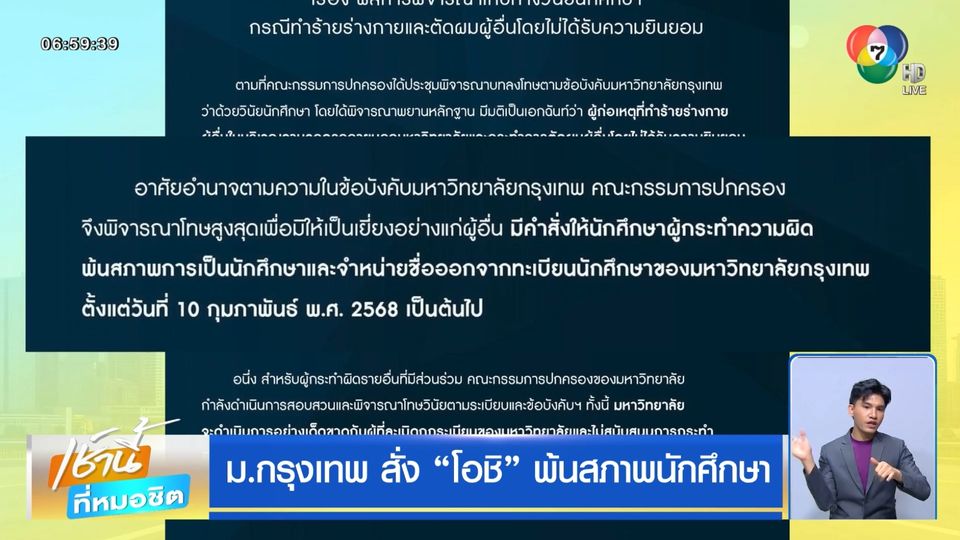 เช้านี้ที่หมอชิต - มหาวิทยาลัยกรุงเทพ มีมติให้ "นายโอชิ" ผู้ก่อเหตุร่วมกล้อนผมรุ่นน้อง พ้นสภาพนักศึกษา สำหรับผู้กระทำผิดคนอื่น ๆ มหาวิทยาลัยกำลังสอบสวน ก่อนพิจารณาโทษวินัยตามระเบียบและข้อบังคับฯ