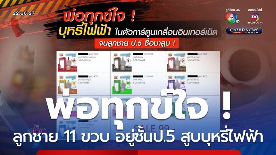 ประเด็นเด็ด 7 สี - พ่อทุกข์ใจ ลูกชายอายุ 11 ขวบ อยู่ชั้น ป.5 สั่งซื้อบุหรี่ไฟฟ้าจากออนไลน์มาสูบ พ่อเข้าแจ้งความ หวังให้ตำรวจช่วยดำเนินคดีกับคนขาย แต่ตำรวจในพื้นที่ไม่รับแจ้งความ และบอกว่าลูกพ่อไปซื้อของผิดกฎหมายเอง