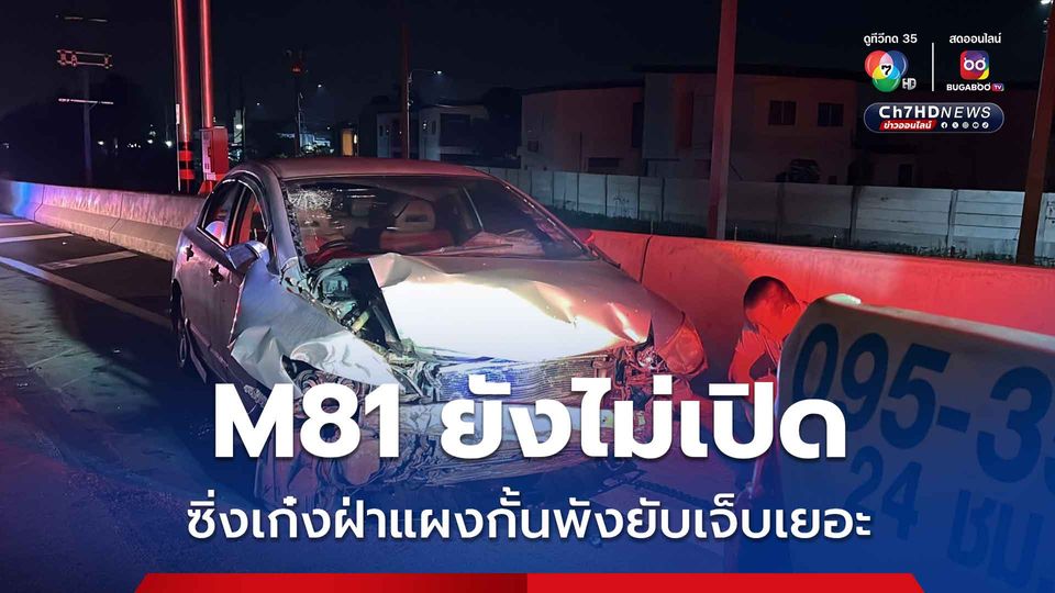 มอเตอร์เวย์สาย M81 ยังไม่เปิดให้ใช้บริการ หนุ่มมีอาการคล้ายคนเมา ซิ่งเก๋งฝ่าแผงกั้นปูนขึ้นไป รถพังยับคนเจ็บเยอะ
