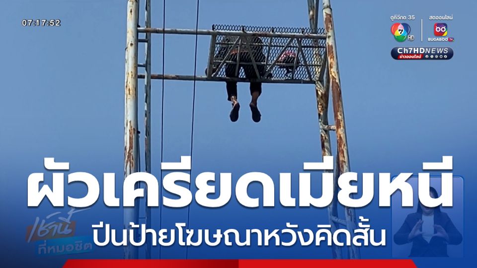 เช้านี้ที่หมอชิต - สามีเครียดหนัก ภรรยาหนีออกจากบ้านหายไป 16 วัน ออกตามหาไม่เจอ ปีนขึ้นเสาเหล็กป้ายโฆษณา สูง 30 เมตร หวังคิดสั้น ตำรวจต้องช่วยเกลี้ยกล่อม