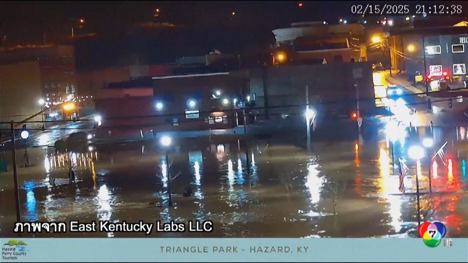 โดยมีการเผยภาพจากกล้องวงจรปิด ที่แสดงให้เห็นสภาพน้ำท่วมที่เพิ่มสูงขึ้น หลังน้ำในแม่น้ำเคนตักกี เอ่อล้นตลิ่งในเมืองฮาซาร์ด รัฐเคนตักกี้ ช่วงเช้าตรู่ของวันอาทิตย์ ส่งผลให้บ้านเรือนในบริเวณใกล้เคียงแม่น้ำ ต้องจมอยู่ใต้น้ำบางส่วน