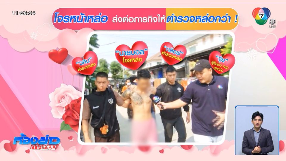 งานนี้หลายคนหลุดโฟกัส โจรหล่อจริงไหมไม่รู้ เพราะเบลอหน้าไว้หมดแล้ว แต่ที่รู้ ๆ เห็นกันชัด ๆ หล่อแบบทะลุจอ คงจะเป็นหนุ่มในเครื่องแบบ 2 สายสืบจาก สภ.คลองหลวง ที่อยู่ข้างผู้ต้องหา หล่อชนะใจนักข่าวช่อง 7HD ทั้งเก่งมาก กล้ามาก