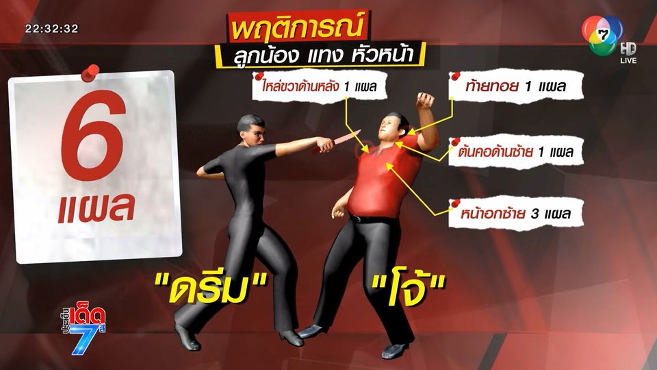 ประเด็นเด็ด 7 สี - พนักงานหนุ่มถือมีดไปแทงผู้จัดการ ซึ่งเป็นหัวหน้างาน เจ้าตัวอ้าง เพราะไม่ได้เงินค่าคอมมิสชัน มีปมทะเลาะถูกเอาเรื่องส่วนตัวไปนินทา งานนี้เพื่อนร่วมงานไม่ปกป้อง เราจะไปติดตามจากรายงานของคุณศราวุธ มีมูซอ ในเจาะเกาะติด