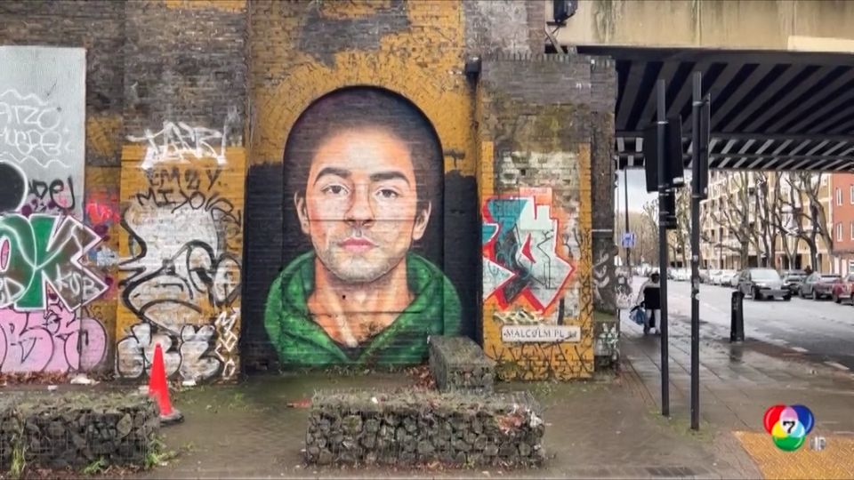 เงียบไปนาน จู่ ๆ หน้าของผู้ต้องหาคดียิงผู้บริหารบริษัทประกันยักษ์ใหญ่ในสหรัฐฯ ก็ไปโผล่เป็นภาพจิตรกรรมฝาผนังบริเวณใต้สะพานรถไฟแห่งหนึ่งในกรุงลอนดอน