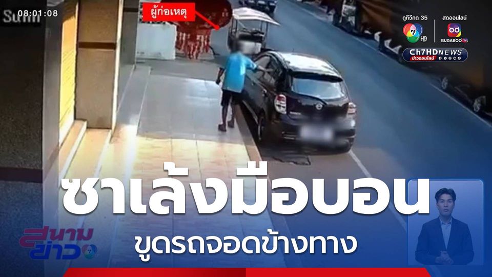 สนามข่าว 7 สี - ทำเพื่ออะไร? คนขี่รถซาเล้ง มือบอน ทุบและขูดรถเก๋งที่จอดอยู่ริมถนนที่ จังหวัดบุรีรัมย์ หลังเกิดเหตุเจ้าของรถออกมาเห็นสภาพรถตัวเองถึงกับเซ็ง