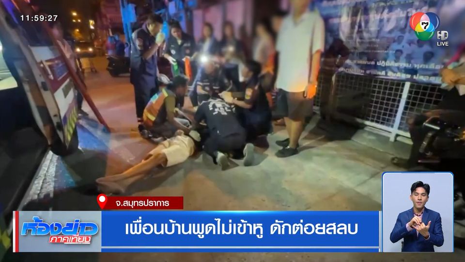 ภาพหน่วยกู้ภัย เข้าช่วยเหลือนายอนันต์ อายุ 70 ปี ที่นอนสลบอยู่กลางถนนในหมู่บ้าน ในซอยแบริ่ง ตำบลสำโรงเหนือ อำเภอเมืองสมุทรปราการ เป็นสาเหตุทำให้ญาติของชายคนดังกล่าว ไม่พอใจบุกไปเอาเรื่อง นายพงศ์ศักดิ์ อายุ 53 ปี ซึ่งเป็นคนที่ต่อยชายอายุ 70 ปี จนสลบ เหตุการณ์ชุลมุนวุ่นวาย จนตำรวจต้องมาระงับเหตุ