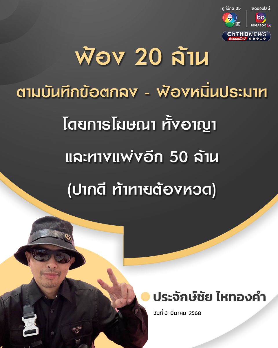 6 มีนาคม 2568 นายห้างประจักษ์ชัย ไหทองคำ โพสต์เฟซบุ๊กกรณีนักร้องสาว ลำไย ไหทองคำ ที่มีการเซ็นสัญญายุติข้อพิพาทเกี่ยวกับการเรื่องแดนเซอร์ชายและอดีตแฟนสาว โดยระบุว่า ฟ้อง 20 ล้าน ตามบันทึกข้อตกลง และจะฟ้องหมิ่นประมาทโดยการโฆษณา ทั้งอาญา และทางแพ่งอีก 50 ล้าน