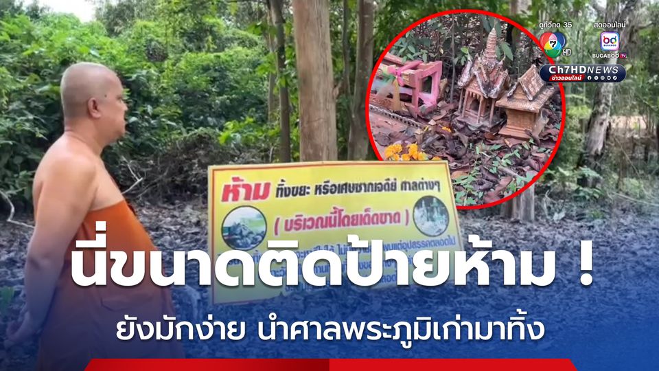 เหนื่อจะพูด! เจ้าอาวาสวัดติดป้ายเตือนคนมักง่ายนำศาลพระภูมิเก่ามาทิ้งด้านหลังวัด เคยจ้างรถแบ็กโฮมาฝังกลบแล้ว ก็ยังมีคนไร้สำนึกมาทิ้งอีก