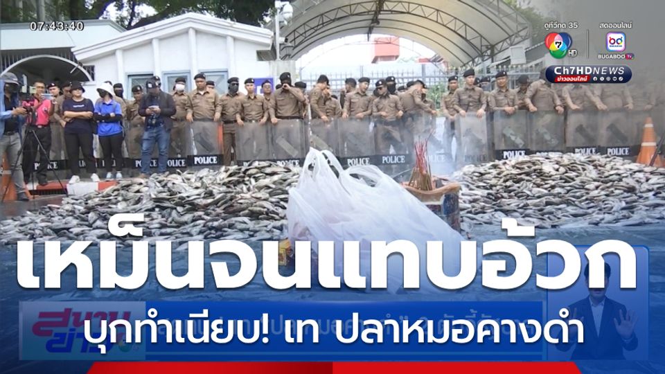 สนามข่าว 7 สี - ผู้ได้รับผลกระทบปลาหมอคางดำ 19 จังหวัด บุกทำเนียบรัฐบาล นำปลาหมอคางดำ 2 ตันเททิ้ง แถมเผาพริกเผาเกลือสาปแช่ง