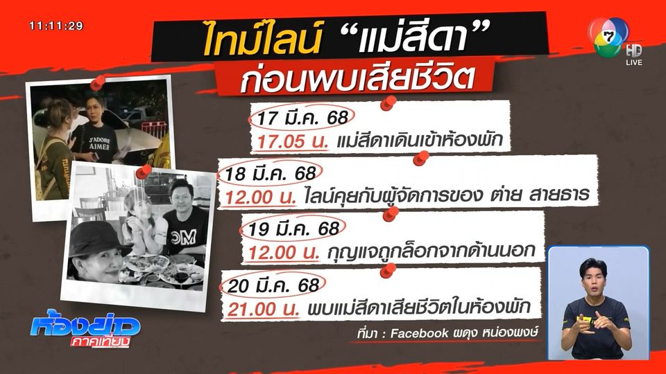 ข้อมูลจาก "ต่าย สายธาร" และผู้จัดการส่วนตัว ยืนยันว่า วันอังคารที่ 18 มีนาคม ยังติดต่อพูดคุยกันได้ถึงช่วงเที่ยง แต่หลังจากนั้นก็ไม่สามารถติดต่อได้อีกเลย นั่นแปลว่าหลังจากที่เข้าห้องไปแล้ว "แม่สีดา" ไม่ได้ออกไปไหนเลย ซึ่งก็สอดคล้องกับภาพวงจรปิด ที่ไม่มีใครเข้าไปหา หรือเอาที่ครอบไปปิดตรงที่บิดกุญแจ