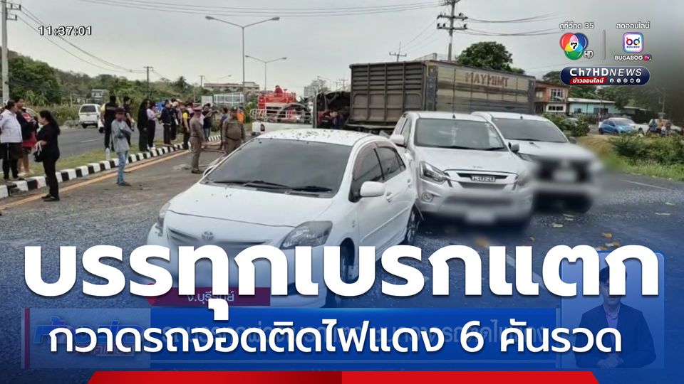 ห้องข่าวภาคเที่ยง - วงจรปิดนาทีระทึก รถบรรทุกพ่วง บรรทุกหินเบรกแตกกวาดรถเก๋ง รถกระบะจอดติดไฟแดง 6 คันรวด เคราะห์ดีไม่มีผู้เสียชีวิต