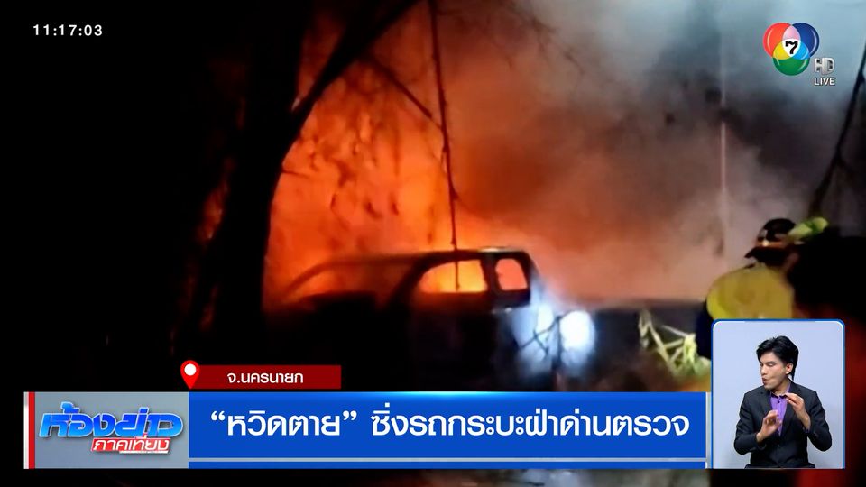 ห้องข่าวภาคเที่ยง - รถกระบะฝ่าด่านตรวจตำรวจที่จังหวัดนครนายก ซิ่งหนีหลุดโค้งพุ่งชนต้นไม้ เกิดระเบิดไฟลุกวอด
