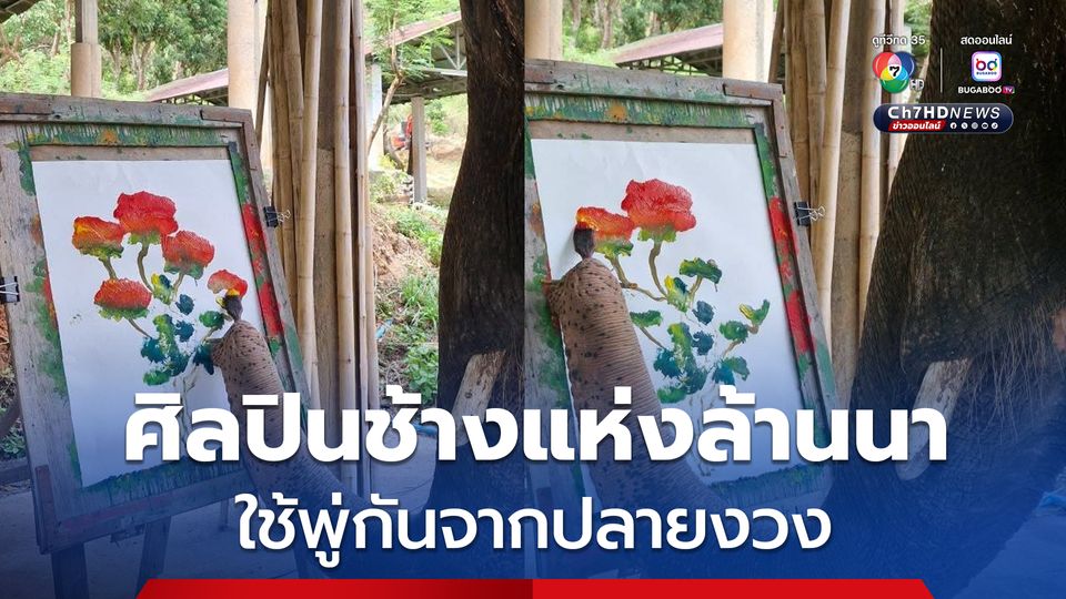 พู่กันจากปลายงวง พระครูอ๊อดชมศิลปะจาก “สีดอปู้หาด” ศิลปินช้างแห่งล้านนา วาดภาพดอกไม้ขนาดใหญ่ ด้วยสีเขียว สีแดง และเฉดอื่น ๆ