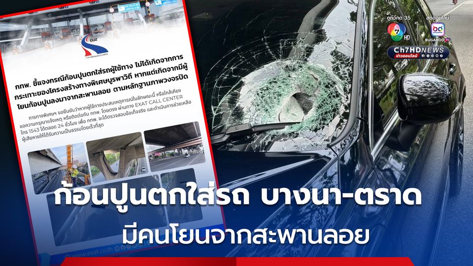 การทางพิเศษฯ ชี้แจง เหตุก้อนปูนตกใส่รถผู้ใช้ทางเส้น บางนา-ตราด ตรวจสอบแล้วไม่ได้มาจากทางด่วน แต่พบคนโยนจากสะพานลอย