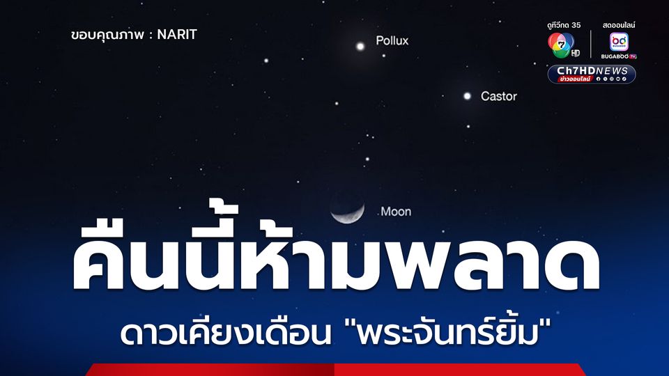 ดวงจันทร์เสี้ยว เคียงดาวพอลลักซ์ และดาวคาสเตอร์ แห่งกลุ่มดาวคนคู่ ชมความสวยงามได้หลังดวงอาทิตย์ลับขอบฟ้าเป็นต้นไป จนถึงเวลาประมาณ 23:00 น."