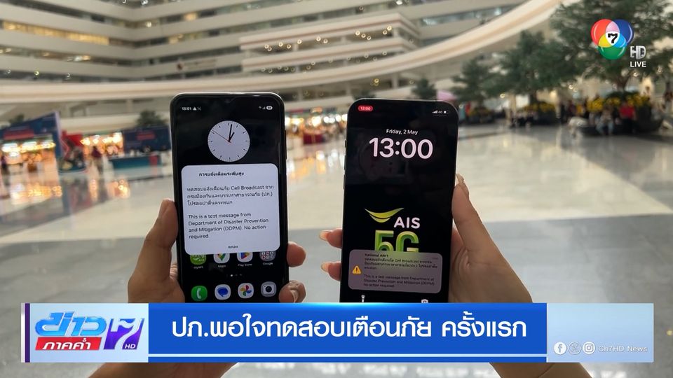 ข่าวภาคค่ำ - วันนี้ (2 พ.ค.) เป็นครั้งแรกในประเทศไทย ที่มีการทดสอบระบบเตือนภัย ผ่าน Cell Broadcast ทุกอย่างเป็นไปด้วยดี แม้จะมีบางคน ที่ไม่ได้รับข้อความก็ตาม
