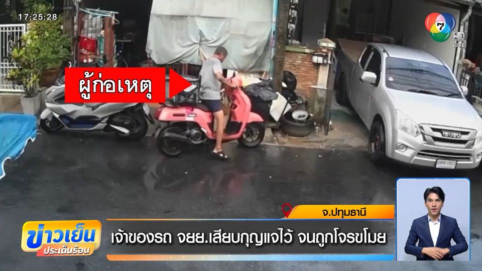 มาที่ปทุมธานี เรียกว่าเป็นอุทาหรณ์ก็ว่าได้ สำหรับเจ้าของรถจักรยานยนต์คันหนึ่ง ในตำบลคูคต อำเภอลำลูกกา ภาพวงจรปิดจะเห็นว่า มีชายคนหนึ่งเดินด้อม ๆ มอง ๆ รถจักรยานยนต์สีชมพูมีกระเป๋าไรเดอร์อยู่ท้ายรถ แลซ้าย แลขวาไม่มีใคร เรียกว่าเข้าตาโจรเลย กุญแจรถเสียบคาไว้ แหมเห็นแบบนี้ก็หวานเจี๊ยบ เลยขึ้นคร่อมบิดกุญแจรถ และสตาร์ตขี่ออกไปเลย ซึ่งเจ้าของรถจักรยานยนต์ออกมาดูรถแล้วไม่เจอรถ จึงเปิดกล้องวงจรปิดดู จึงรู้ว่าโดนขโมยไปแล้ว