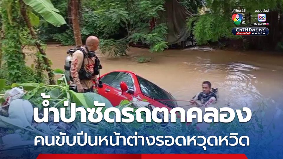 ชายอายุ 65 ปี ขับรถไปทำบุญที่วัด ระหว่างทาง รถถูกน้ำป่าซัดตกคลองจมมิด โชคดีคนขับมีสติ รีบปีนออกทางกระจกประตู รอดหวุดหวิด