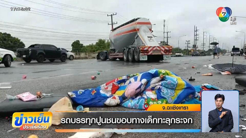 ข่าวเย็นประเด็นร้อน - ชายพาภรรยาและลูก 4 ชีวิต นั่งในรถบรรทุกปูน ระหว่างทางเกิดฝนตกหนักถนนลื่น รถเสียหลักพุ่งชนแบร์ริเออร์ข้างทางอย่างแรง ทำให้คนขับ ภรรยา ลูกชายอายุ 1 ขวบ และ 6 ขวบ กระเด็นทะลุกระจกหน้ารถไปกระแทกกับพื้นถนน บาดเจ็บสาหัส
