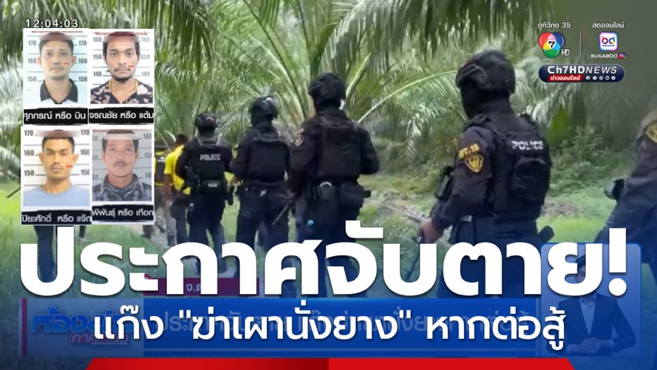 ห้องข่าวภาคเที่ยง - ตำรวจนับร้อยนาย ยังปิดล้อมเทือกเขาบรรทัด ตามล่า "บิน ควนกุน" กับพวกรวม 4 คน ผู้ต้องหาฆ่าเผานั่งยางในสวนปาล์มน้ำมัน พร้อมทั้งประกาศใช้มาตรการเด็ดขาด จับตายหากต่อสู้