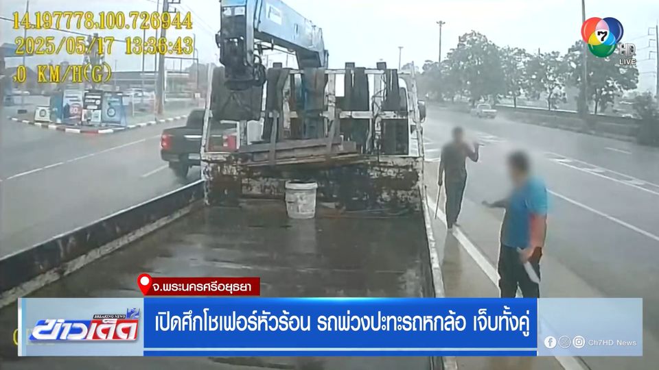 ปาดมาซะขนาดนี้ใครจะเบรกทัน รถพ่วงชนท้ายรถหกล้อโครมใหญ่ จุดชนวนอารมณ์เดือด หนุ่มโชเฟอร์หกล้อถือท่อนเหล็กปรี่มาที่รถพ่วง หนุ่มเสื้อฟ้าก็ไม่ยอม คว้ามีดมาไล่ฟันไม่ยั้ง ต่างฝ่ายต่างบาดเจ็บจนได้เลือด ก่อนโทรแจ้งตำรวจ และประกันมาตรวจสอบ เหตุเกิดบนถนนหมายเลข 9 มุ่งหน้าสระบุรี อำเภอบางปะอิน จังหวัดพระนครศรีอยุธยา