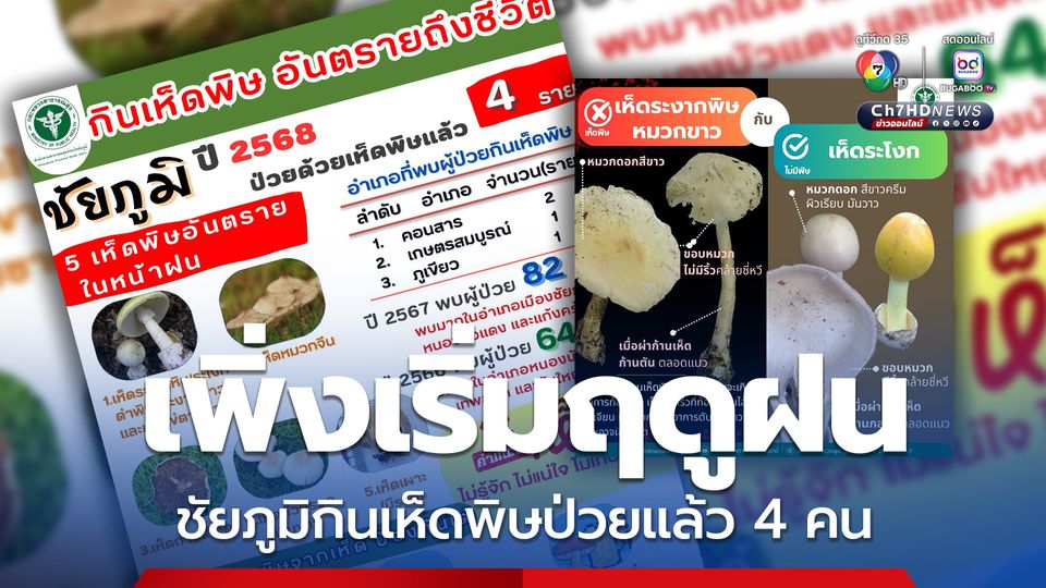สถานการณ์โรคอาหารเป็นพิษจากการกินเห็ดพิษ ข้อมูล ณ วันที่ 21 พ.ค. 2568 จังหวัดชัยภูมิป่วยแล้ว 4 ราย พบใน อ.คอนสาร 2 คน อ.เกษตรสมบูรณ์ 1 คน และ อ.ภูเขียว 1 คน โดยในปี 2567 จ.ชัยภูมิ มีผู้ป่วยจากการกินเห็ดพิษมากถึง 82 คน พบมากใน อ.เมืองชัยภูมิ อ.หนองบัวแดง อ.แก้งคร้อ