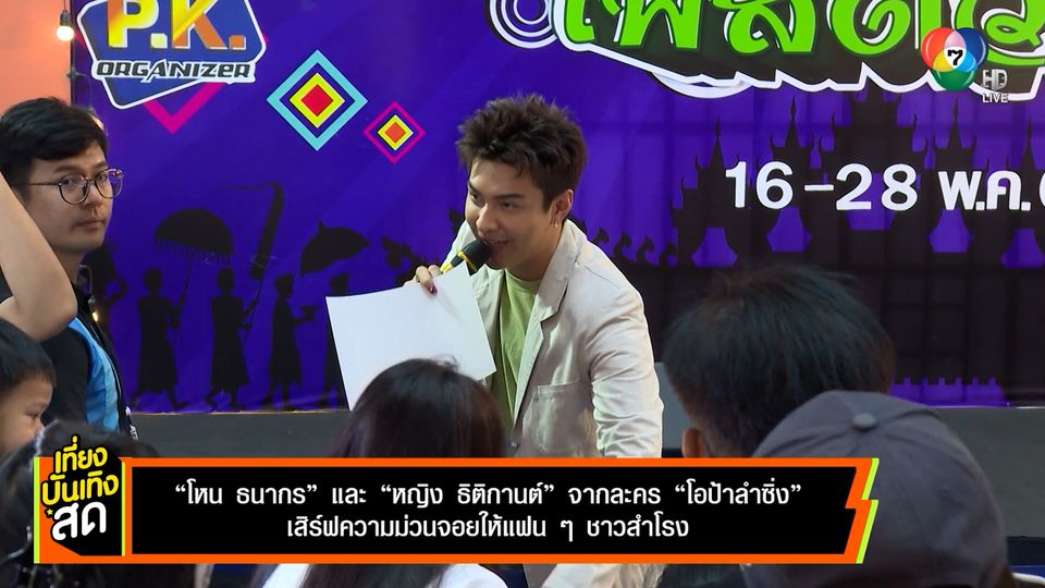 เที่ยงบันเทิงสด - มาที่ความม่วนจอยของ 2 นักแสดงจากละคร โอป้าลำซิ่ง โหน ธนากร และ หญิง ธิติกานต์ เค้าไปเสิร์ฟความสนุกให้แฟน ๆ อย่างใกล้ชิดกันที่ อิมพีเรียล สำโรง ร่วมเล่นเกม แจกของรางวัลเพียบ ทั้งเสื้อสวย ๆ จากละคร โอป้าลำซิ่ง และเสื้อจากช่อง 7HD รวมถึง หนุ่มโหนยังเอาโปสเตอร์เพลงใหม่ของตัวเอง พร้อมลายเซ็น มาแจกให้แฟน ๆ ที่งานนี้อีกด้วย และแน่นอนจะขาดเสียงเพลงได้ยังไง จัดไปเลยกับมินิคอนเสิร์ตของ โหน และ หญิง เรียกว่าแฟน ๆ ที่มาแฮปปีมีรอยยิ้มกลับบ้านกันไปทุกคน