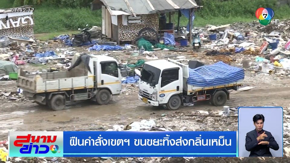 ภาพรถบรรทุกขนขยะมาเททิ้ง ส่งกลิ่นเหม็นเน่า สร้างความเดือดร้อนให้ชาวบ้าน ยิ่งช่วงนี้หน้าฝน ทำให้น้ำขยะไหลมาหนักกว่าเดิมอีก