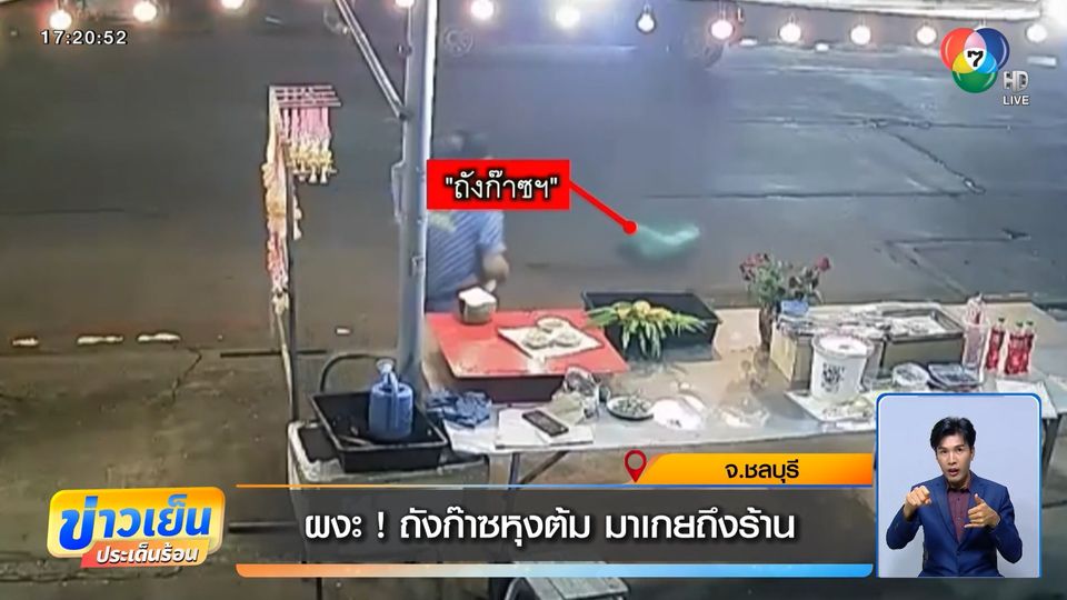 สีเขียว ๆ กลิ้งหลุน ๆ มาถึงหน้าร้านเลยคุณผู้ชม ที่เห็นนั่นคือ "ถังก๊าซหุงต้ม น้ำหนัก 15 กิโลกรัม" กลิ้งข้ามถนน มาหยุดที่หน้าร้านขายพวงมาลัยดอกไม้ เจ้าของร้าน ถึงกับยืนจังงัง เพราะหวั่นใจว่า ถังก๊าซฯ จะระเบิดหรือไม่