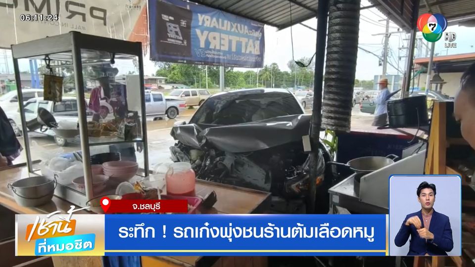 เช้านี้ที่หมอชิต - ลูกค้าวิ่งหนีตายระทึก หลังรถเก๋งพุ่งชนร้านต้มเลือดหมู คนขับอ้างถูกรถตัดหน้า ต้องเบรกกระทันหันจนเสียหลัก